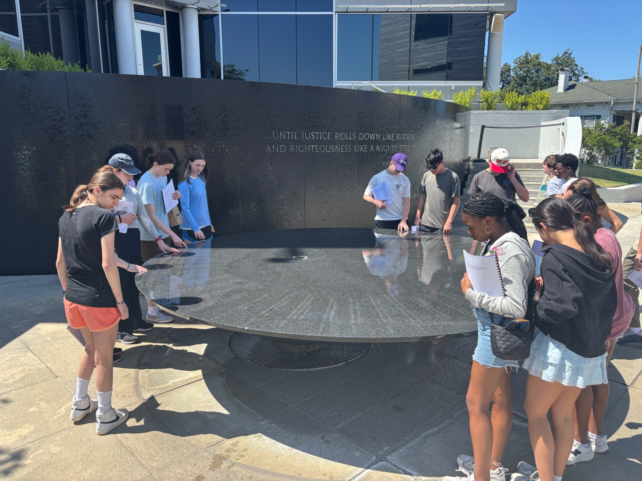 The Civil Rights Memorial at SPLC (pictured here with the Class of 2026) is a tribute to martyrs of the movement. The memorial was created by artist Maya Lin and dedicated in 1989. Lin found inspiration from MLK’s I Have a Dream Speech: “We will not be satisfied until justice rolls down like waters and righteousness like a mighty stream.”