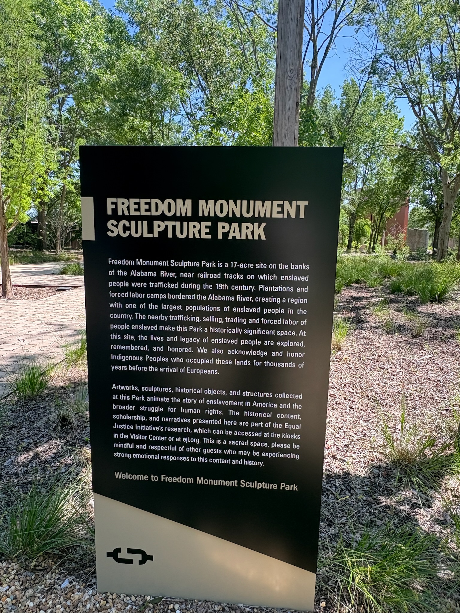 The 17-acre site overlooks the Alabama River. The sculpture park honors the lives and memories of the 10 million Black people who were enslaved in America and celebrates their courage and resilience.